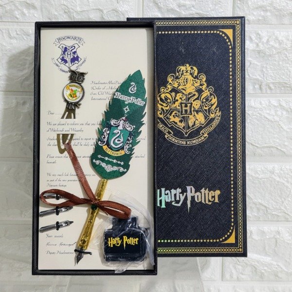 Set Harry Potter pluma + plumas remplazo + tinta + marcapáginas Slytherin